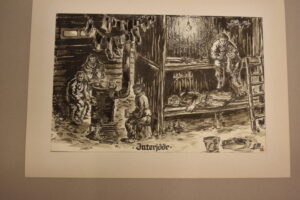 Tööpataljonlased puhkehetkel. Barakis kahekordsel naril magab alumisel korrusel üks mees, ülemisel korrusel nõelub teine sokki. Kolm meest istuvad raudahju ümber - soojendavad käsi ja joovad teed. Ahju kohal ripub nöör kuivavate riietega. Onnis põleb elektrilamp. Palkseinas on kitsas, kahe ruuduga aken.