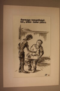 Naril istub mees, tema põlvedel on laud, sellel kaks "pläru". Tema ees seisab mees, paremas käes leivatükk. Istuv mees on hangeldaja, ilmselgelt heas toitumuses, kes elab represseeritute vajaduste pealt. Toitev leib vahtatatakse sigarettide vastu. Pildi annotatsioon on järgmine: Surmaga hangeldajad. 100g leiba = 2 "pläru".