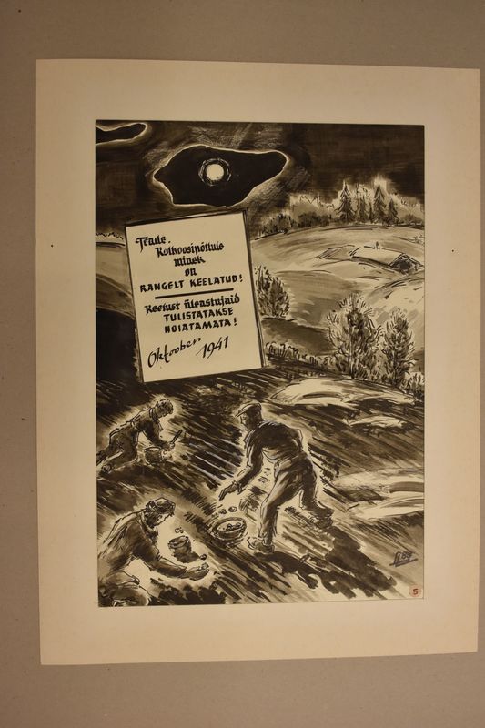 Pilt kartulipõllul askeldavast kolmest mehest, kes kuuvalgel ööl püüavad salaja käte ning kaevekepikesega oma korve ja katelokke kartulitega täita. Pildi keskel on raamistatud silt "Teade. Kolhoosipõllule minek on RANGELT KEELATUD. Keelust üleastujaid TULISTATAKSE HOIATAMATA! Oktoober 1941". Kaugemal on näha metsatukka ning ühte barakki.