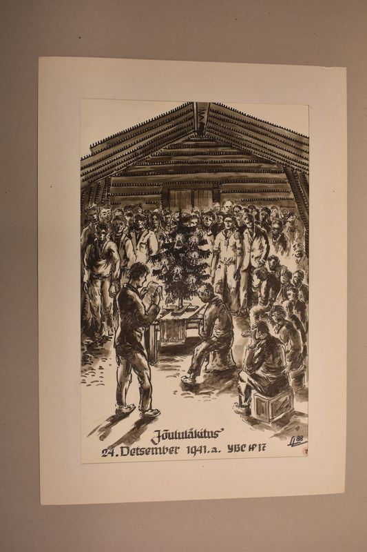 Stseen kujutab jõulude pidamist barakis 1941. aastal. Tööpataljonis teenivad, rusutud nägudega mehed on kogunenud ümber laual seisva kaunistatud jõulukuuse - osad inimestest seisavad, osad istuvad, üks meestest loeb ette jõululäkitust. Pildi allkirja all on kirillitsas laagrit tähistav akronüüm YBC HP 17.