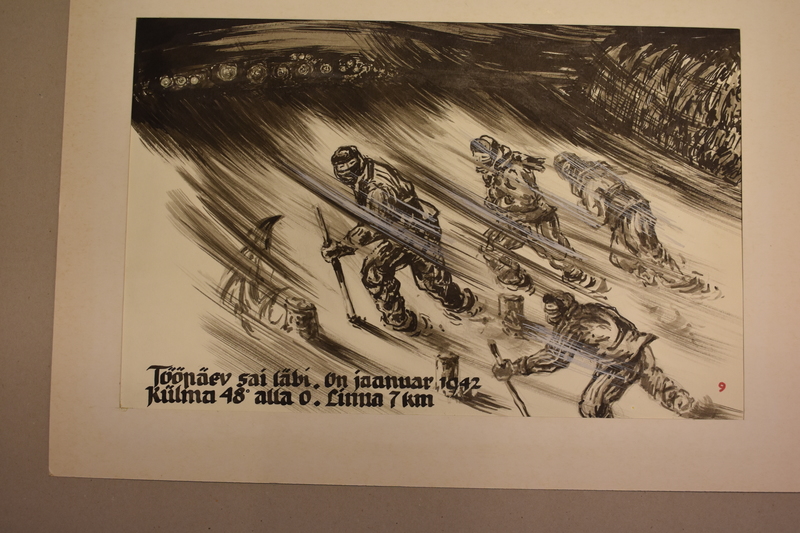 Joonistus neljast läbi tuisu edasi liikuvast mehest, kes sumpavad teadmata linna poole. Teose pealkirjaks on "Tööpäev sai läbi. On jaanuar 1942. Külma 48 alla 0. Linna 7 km". Kahel läbi tuule trügival mehel on toetuseks käes puust kepid, kõigil on sallid lume vastu silmini tõmmatud.