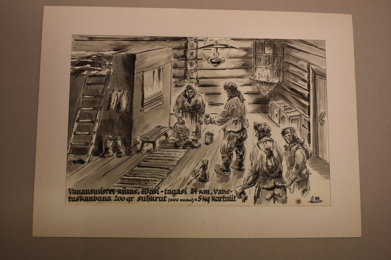 Kolm tööpataljoni meest on tulnud kohalikku vanausuliste külla, et vahetuskaupa teha. Teekond laagrist külla ja tagasi oli 24 km. Vahetuskaubaks on meestel kaasa võetud 200 gr suhkrut (kuu norm), mille eest kohalik vanaeideke annab neile korvi 5 kg kartulitega. Pilt kujutab vanaeide elamist oma tares. Tuba täidab suur, vene stiilis lavatsiga ahi, mille otsa viib redel. Laes ripub pertrooliumlamp ning toa ühes otsas on pühanurk ikoonide ning küünaldega. Seintel ja põrandal omakootud vaibad.