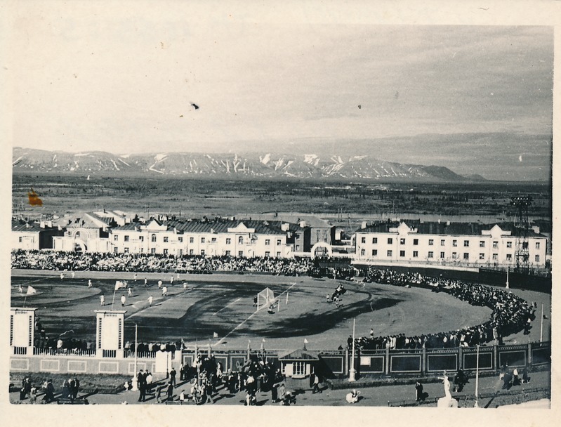 Kaugvaade: esiplaanil on staadion. Inimesed on staadionil ja staadioni väravate juures. Taustaks on mõned majad ja mäed. Norilsk, Siber. 1950.aastate algus.
