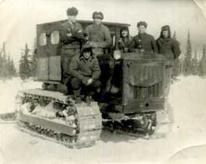 Represseeritu Vambola Ülenõmm talvistel metsatöödel. 6 meest traktori juures.