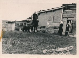 Represseeritu Anton Roop (hobuse seljas) elamu ees. Venemaa, Siber, Igarka, 1954-1958. Kogu: Tartu Linnaajaloo Muuseumid / Tartu Linnamuuseum Eseme viide: TM F 1259:11