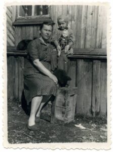 Represseeritu Tatjana Kask ja Siberis sündinud Merike Ülenõmm (lapsel on käes nukk) maja ees.