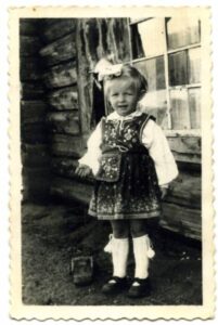 Represseeritute Dagmar ja Vambola Ülenõmme 3-aastane Merike Ülenõmm palkmaja ees, kus ta sündis. Siber, Altai eelmäestik, Krasnojarski krai, Pihtatsi; 27.07.1952. Kogu: Tartu Linnaajaloo Muuseumid / Tartu Linnamuuseum Eseme viide: TM F 1259:22