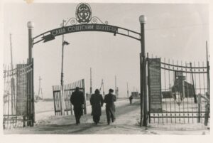 Inta vangilaagri kaevanduste nr 11 ja nr 12 sissepääsuvärav, mille kohal venekeelne silt (Au nõukogude kaevuritele!); kõrval venekeelne silt ( Elagu Nõukogude Liidu kommunistlik partei ...)