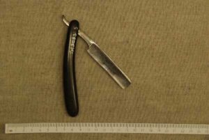 Endel Kaseoja omavalmistatud habemenuga, mille otsast võib näha sini-must valget värvikombinatsiooni.