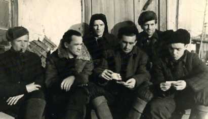 Eestlased-pillimehed suitsutundi pidamas. Paremalt 3. on Endel Kaseoja. Irkutski oblasti Tšunaa (Tšukaa?) vangilaager.
