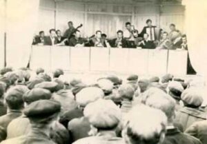Vangidest moodustatud estraadiorkestri esinemine kuulajate ees.