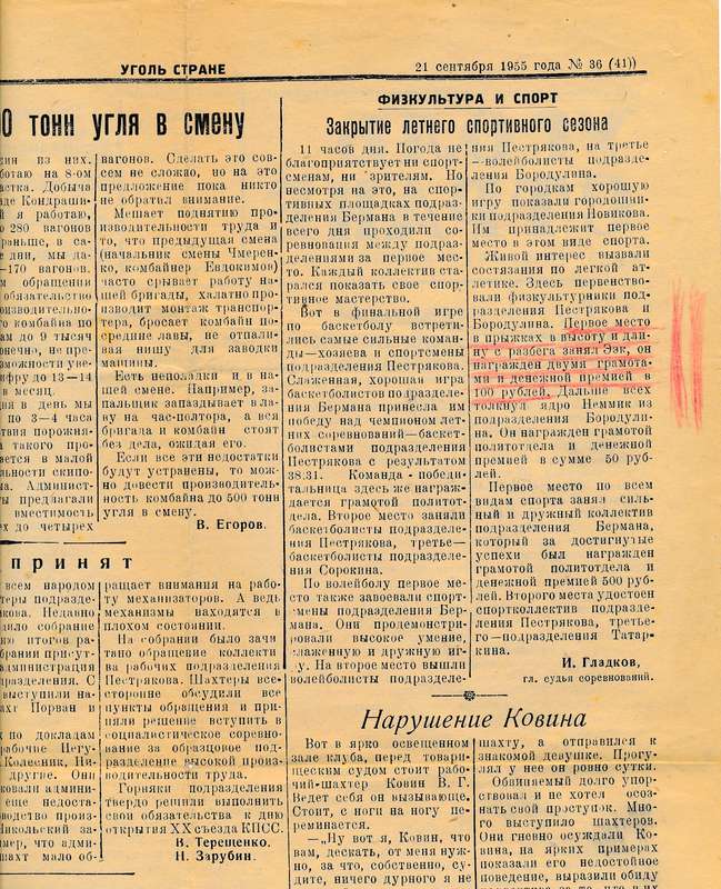 Inta vangilaagri ajaleht Уголь стране 21.09.1955 artikliga vangilaagritevahelistest spordivõistlustest.